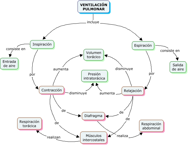 Ventilación pulmonar, Relajación aumenta Presión intratorácica, Contracción de Músculos intercostales, Contracción disminuye Presión intratorácica, Espiración consiste en Salida de aire, VENTILACIÓN PULMONAR incluye Inspiración, Relajación disminuye Volumen torácico, VENTILACIÓN PULMONAR incluye Espiración, Inspiración por Contracción, Espiración por Relajación, Inspiración consiste en Entrada de aire