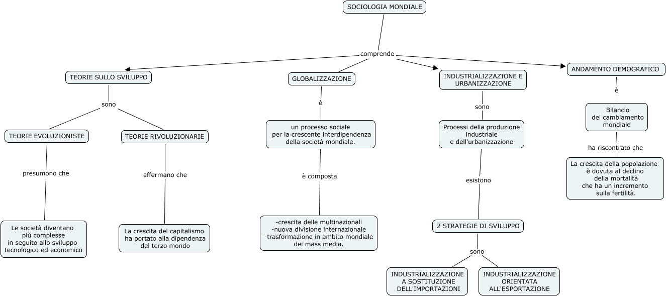 SOCIOLOGIA MONDIALE 4, SOCIOLOGIA MONDIALE comprende ANDAMENTO DEMOGRAFICO, 2 STRATEGIE DI SVILUPPO sono INDUSTRIALIZZAZIONE ORIENTATA ALL'ESPORTAZIONE, SOCIOLOGIA MONDIALE comprende GLOBALIZZAZIONE, TEORIE EVOLUZIONISTE presumono che Le società diventano più complesse in seguito allo sviluppo tecnologico ed economico, un processo sociale per la crescente interdipendenza della società mondiale. è composta -crescita delle multinazionali -nuova divisione internazionale -trasformazione in ambito mondiale dei mass media., TEORIE RIVOLUZIONARIE affermano che La crescita del capitalismo ha portato alla dipendenza del terzo mondo, TEORIE SULLO SVILUPPO sono TEORIE RIVOLUZIONARIE, INDUSTRIALIZZAZIONE E URBANIZZAZIONE sono Processi della produzione industriale e dell'urbanizzazione, TEORIE SULLO SVILUPPO sono TEORIE EVOLUZIONISTE, SOCIOLOGIA MONDIALE comprende INDUSTRIALIZZAZIONE E URBANIZZAZIONE