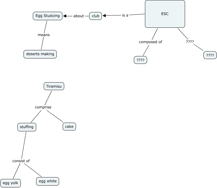 tiramisu, club about Egg Studying, ESC ???? ????, Tiramisu comprise stuffing, stuffing consist of egg white, ESC composed of ????, Tiramisu comprise cake, ESC is a club, stuffing consist of egg yolk, Egg Studying means deserts making