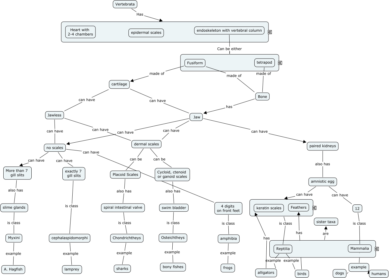 M. Kim-Ex 4C-Vertebrate Phyl, 4 digits on front feet is class amphibia, cartilage can have Jaw, spiral intestinal valve is class Chondrichtheys, dermal scales can be Placoid Scales, Chondrichtheys example sharks, Fusiform made of Bone, More than 7 gill slits also has slime glands, Bone has Jaw, Reptilia example birds, no scales can have exactly 7 gill slits