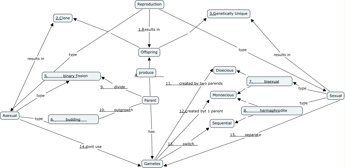 Daniel Fong 4D, Reproduction 1.Results in Offspring, Gametes 13. switch Sequential, Parent has Gametes, Reproduction type Asexual, Gametes 11. created by two parends Dioecious, Asexual type 6. budding, Gametes 12.created byt 1 parent Monoecious, Sexual results in 3.Genetically Unique, Parent 10. outgrowth 6. budding, Sexual type 7. bisexual