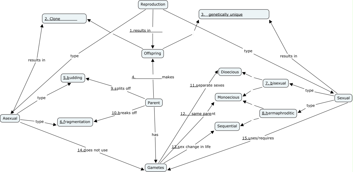 Misha Kim-Ex 4D-Reproduction, Gametes 13.sex change in life Sequential, Reproduction 1.results in Offspring, Reproduction type Asexual, Parent has Gametes, Gametes 12. same parent Monoecious, Asexual type 6.fragmentation, Gametes 11.separate sexes Dioecious, Sexual results in 3. genetically unique, Parent 10.breaks off 6.fragmentation, 7. bisexual Dioecious