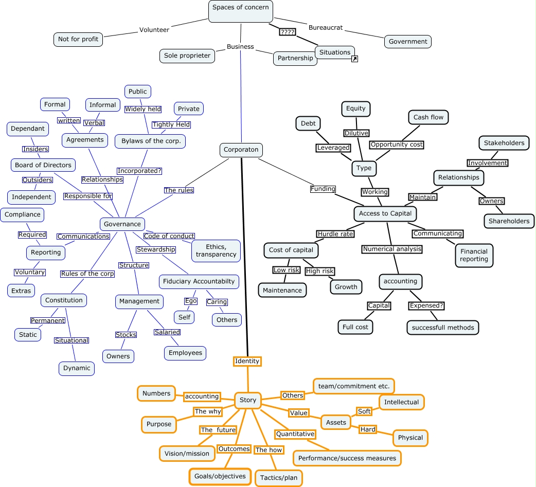 Situation, Bylaws of the corp. Widely held Public, Assets Soft Intellectual, Access to Capital Hurdle rate Cost of capital, Story The future Vision/mission, Agreements Verbal Informal, Spaces of concern Business Sole proprieter, Relationships Involvement Stakeholders, Story The why Purpose, Spaces of concern Bureaucrat Government, Cost of capital High risk Growth