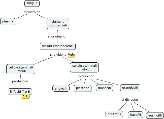 Sangue tamara, cellule staminali mieloidi producono granulociti, cellule staminali linfoidi producono linfociti T e B, sangue formato da elementi corpuscolati, cellule staminali mieloidi producono piastrine, cellule staminali mieloidi producono monociti, cellule staminali mieloidi producono eritrociti, tessuti ematopoietici si dividono cellule staminali linfoidi, tessuti ematopoietici si dividono cellule staminali mieloidi, granulociti si dividono eosinofili, granulociti si dividono basofili