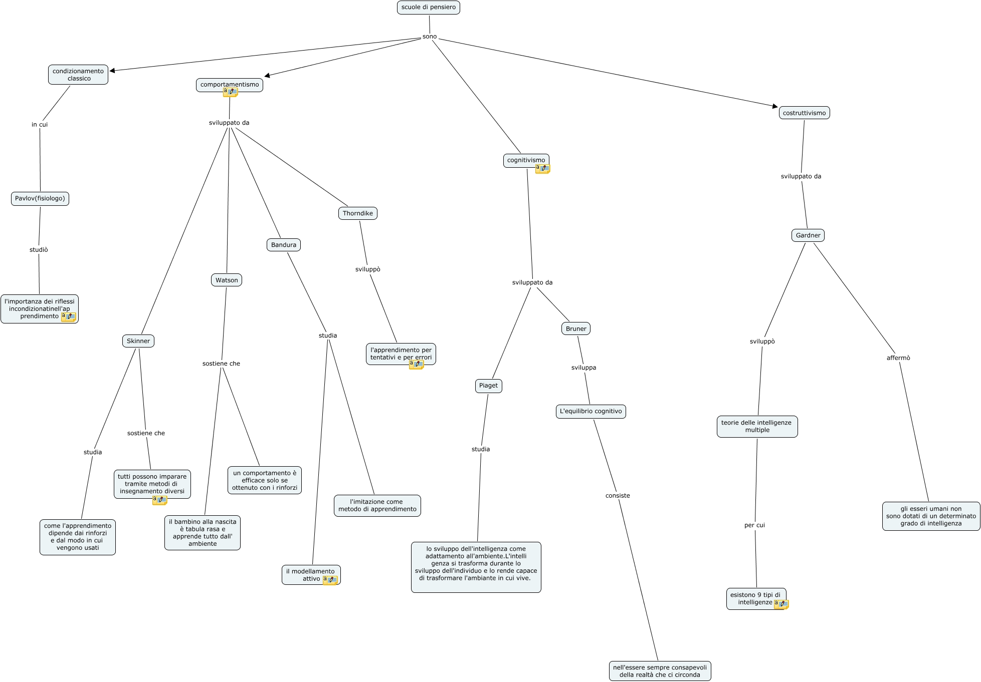 Questa Cmap, creata con IHMC CmapTools, contiene informazioni relative a: l'apprendimento secondo le varie scuole di pensiero, Watson sostiene che un comportamento è efficace solo se ottenuto con i rinforzi, Piaget studia lo sviluppo dell'intelligenza come adattamento all'ambiente.L'intelli genza si trasforma durante lo sviluppo dell'individuo e lo rende capace di trasformare l'ambiante in cui vive., scuole di pensiero sono costruttivismo, Watson sostiene che il bambino alla nascita è tabula rasa e apprende tutto dall' ambiente, comportamentismo sviluppato da Bandura, comportamentismo sviluppato da Watson, Pavlov(fisiologo) studiò l'importanza dei riflessi incondizionatinell'ap prendimento, Bandura studia il modellamento attivo, Bruner sviluppa L'equilibrio cognitivo, Gardner sviluppò teorie delle intelligenze multiple, scuole di pensiero sono condizionamento classico, L'equilibrio cognitivo consiste nell'essere sempre consapevoli della realtà che ci circonda, costruttivismo sviluppato da Gardner, cognitivismo sviluppato da Bruner, comportamentismo sviluppato da Skinner, scuole di pensiero sono comportamentismo, Gardner affermò gli esseri umani non sono dotati di un determinato grado di intelligenza, Thorndike sviluppò l'apprendimento per tentativi e per errori, Bandura studia l'imitazione come metodo di apprendimento, comportamentismo sviluppato da Thorndike