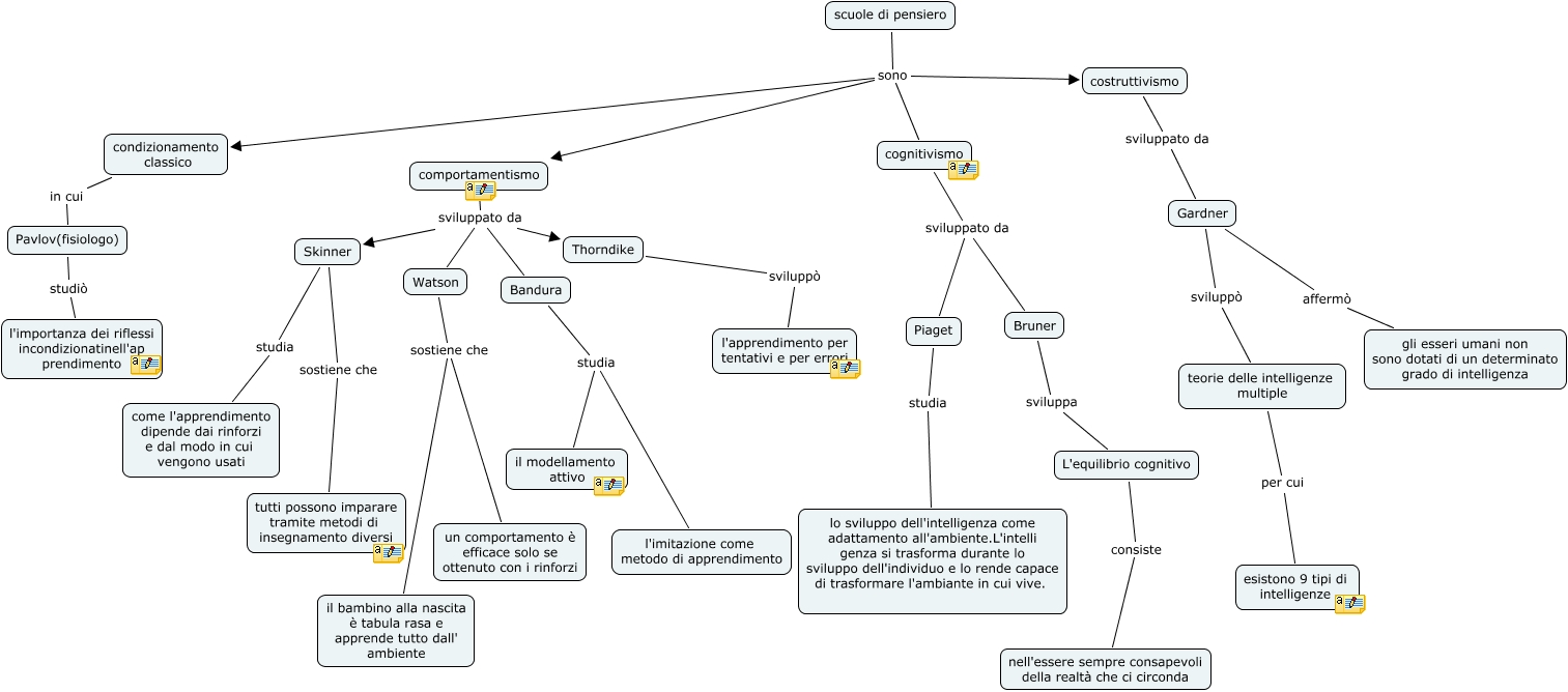 l'apprendimento 7, Watson sostiene che un comportamento è efficace solo se ottenuto con i rinforzi, Piaget studia lo sviluppo dell'intelligenza come adattamento all'ambiente.L'intelli genza si trasforma durante lo sviluppo dell'individuo e lo rende capace di trasformare l'ambiante in cui vive., scuole di pensiero sono costruttivismo, Watson sostiene che il bambino alla nascita è tabula rasa e apprende tutto dall' ambiente, comportamentismo sviluppato da Bandura, comportamentismo sviluppato da Watson, Pavlov(fisiologo) studiò l'importanza dei riflessi incondizionatinell'ap prendimento, Bandura studia il modellamento attivo, Bruner sviluppa L'equilibrio cognitivo, Gardner sviluppò teorie delle intelligenze multiple