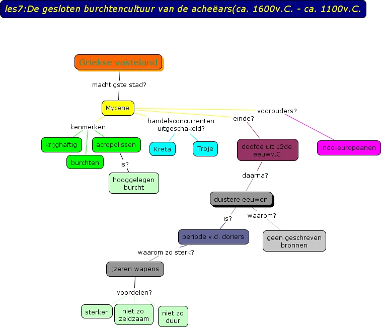 2Aa freke vanderperren les7, duistere eeuwen waarom? geen geschreven bronnen, periode v.d. doriers waarom zo sterk? ijzeren wapens, Mycene handelsconcurrenten uitgeschakeld? Troje, acropolissen is? hooggelegen burcht, ijzeren wapens voordelen? niet zo zeldzaam, Griekse vasteland machtigste stad? Mycene, Mycene kenmerken acropolissen, Mycene einde? doofde uit 12de eeuwv.C., Mycene handelsconcurrenten uitgeschakeld? Kreta, duistere eeuwen is? periode v.d. doriers