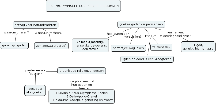 2aA Jakob Van de Velde les 19, organisatie religieuze feesten panhelleense feesten? feest voor alle grieken, griekse goden=supermensen kritiek? te menselijk, griekse goden=supermensen hoe waren ze? volmaakt,machtig, menselijke gevoelens, èèn familie, ontzag voor natuurkrachten waarom offeren? gunst v/d goden, griekse goden=supermensen verschillen? perfect,eeuwig leven, griekse goden=supermensen kritiek? lijden en dood is een vraagteken, ontzag voor natuurkrachten 3 natuurkrachten? zon,zee,Gaia(aarde), griekse goden=supermensen kenmerken: mysteriegodsdienst? 1 god, gellukig hiernamaals, organisatie religieuze feesten drie plaatsen met hun goden en hun feesten 1)Olympia-Zeus-Olympische Spelen 2)Delfi-Apollo-Orakel 3)Epidauros-Asclepius-genezing en troost