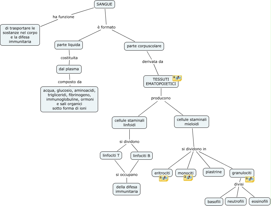 sangue, cellule staminali mieloidi si dividono in monociti, granulociti divisi neutrofili, cellule staminali mieloidi si dividono in granulociti, TESSUTI EMATOPOIETICI producono cellule staminali linfoidi, SANGUE ha funzione di trasportare le sostanze nel corpo e la difesa immunitaria, cellule staminali mieloidi si dividono in piastrine, linfociti T si occupano della difesa immunitaria, granulociti divisi eosinofili, SANGUE è formato parte liquida, linfociti B si occupano della difesa immunitaria