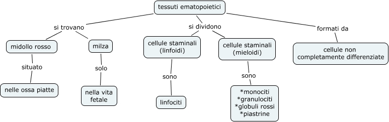 tessuti ematopoietici Raissa, cellule staminali (linfoidi) sono linfociti, milza solo nella vita fetale, tessuti ematopoietici formati da cellule non completamente differenziate, tessuti ematopoietici si dividono cellule staminali (linfoidi), tessuti ematopoietici si trovano milza, tessuti ematopoietici si dividono cellule staminali (mieloidi), cellule staminali (mieloidi) sono *monociti *granulociti *globuli rossi *piastrine, midollo rosso situato nelle ossa piatte, tessuti ematopoietici si trovano midollo rosso