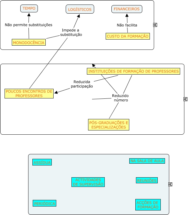 1.3.2, CUSTO DA FORMAÇÃO Não facilita FINANCEIROS, INSTITUIÇÕES DE FORMAÇÃO DE PROFESSORES Reduzido número PÓS-GRADUAÇÕES E ESPECIALIZAÇÕES, INSTITUIÇÕES DE FORMAÇÃO DE PROFESSORES Reduzido número RECURSOS ORGANIZACIONAIS, INSTITUIÇÕES DE FORMAÇÃO DE PROFESSORES Reduzida participação POUCOS ENCONTROS DE PROFESSORES, MONODOCÊNCIA Impede a substituição POUCOS ENCONTROS DE PROFESSORES, MONODOCÊNCIA Impede a substituição LOGÍSTICOS, RECURSOS ORGANIZACIONAIS Reduzido número PÓS-GRADUAÇÕES E ESPECIALIZAÇÕES, MONODOCÊNCIA Não permite substituições TEMPO