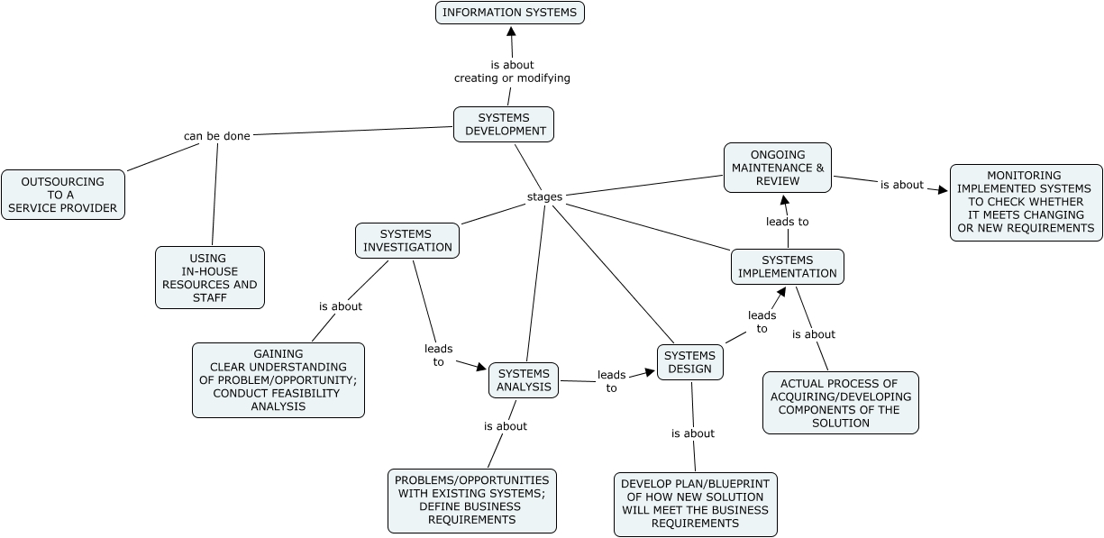 This Concept Map has information related to: What is Systems Development, SYSTEMS IMPLEMENTATION is about ACTUAL PROCESS OF ACQUIRING/DEVELOPING COMPONENTS OF THE SOLUTION, SYSTEMS DEVELOPMENT stages SYSTEMS IMPLEMENTATION, ONGOING MAINTENANCE & REVIEW is about MONITORING IMPLEMENTED SYSTEMS TO CHECK WHETHER IT MEETS CHANGING OR NEW REQUIREMENTS, SYSTEMS DESIGN leads to SYSTEMS IMPLEMENTATION, SYSTEMS DEVELOPMENT is about creating or modifying INFORMATION SYSTEMS, SYSTEMS DEVELOPMENT can be done OUTSOURCING TO A SERVICE PROVIDER, SYSTEMS IMPLEMENTATION leads to ONGOING MAINTENANCE & REVIEW, SYSTEMS DEVELOPMENT stages SYSTEMS ANALYSIS, SYSTEMS INVESTIGATION is about GAINING CLEAR UNDERSTANDING OF PROBLEM/OPPORTUNITY; CONDUCT FEASIBILITY ANALYSIS, SYSTEMS DEVELOPMENT stages SYSTEMS DESIGN
