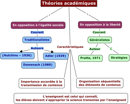 Theo_academiques, Théories académiques Caractéristiques L'enseignant est celui qui connaît, les élèves doivent s'approprier la science transmise par l'enseignant, Traditionalistes Auteurs (Hutchins – 1936), Généralistes Auteur Pratte, 1971, Traditionalistes Auteurs Adler (1939), Théories académiques Caractéristiques Importance accordée à la transmission de contenus, Théories académiques i En opposition à la liberté, Traditionalistes Auteurs Domenach (1989), En opposition à la liberté Courant Généralistes, Théories académiques i En opposition à l'égalité sociale, Généralistes C Stratégies