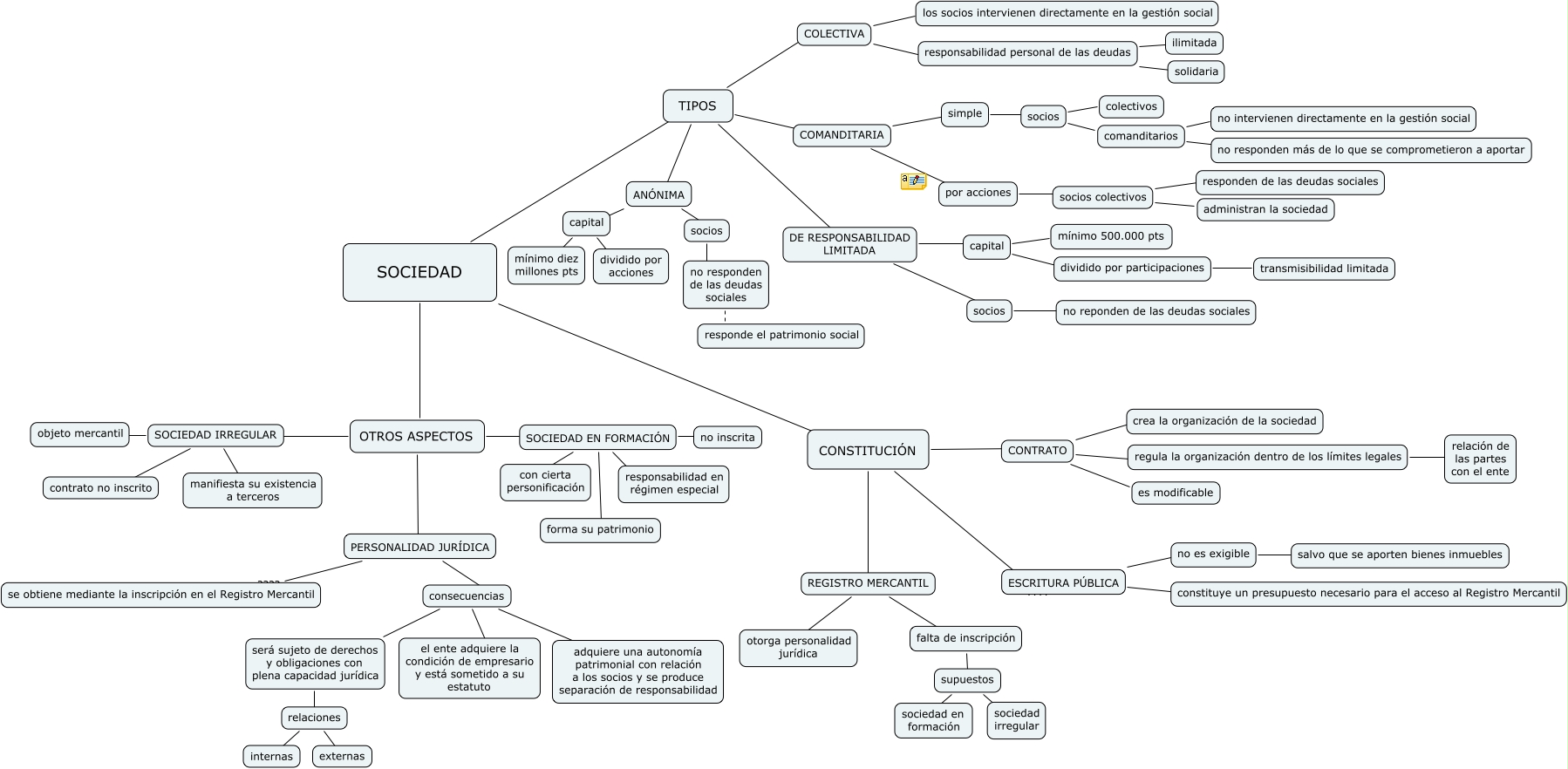 sociedad, SOCIEDAD ???? TIPOS, COLECTIVA ???? responsabilidad personal de las deudas, COMANDITARIA ???? por acciones, socios colectivos ???? responden de las deudas sociales, SOCIEDAD IRREGULAR ???? objeto mercantil, simple ???? socios, CONTRATO ???? regula la organización dentro de los límites legales, SOCIEDAD IRREGULAR ???? manifiesta su existencia a terceros, consecuencias ???? será sujeto de derechos y obligaciones con plena capacidad jurídica, SOCIEDAD EN FORMACIÓN ???? forma su patrimonio