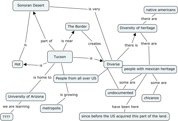 Tucson Is, people with mexican heritage some are chicanos, Tucson part of Sonoran Desert, University of Arizona we are learning ????, people with mexican heritage some are undocumented, Sonoran Desert is Hot, people with mexican heritage have been here since before the US acquired this part of the land., Sonoran Desert is very Diverse, Tucson is Diverse, Diverse there is Diversity of heritage, Tucson is home to University of Arizona