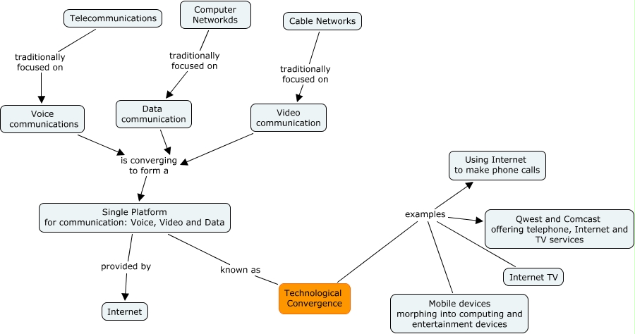 Technological Convergence, Video communication is converging to form a Single Platform for communication: Voice, Video and Data, Single Platform for communication: Voice, Video and Data provided by Internet, Data communication is converging to form a Single Platform for communication: Voice, Video and Data, Voice communications is converging to form a Single Platform for communication: Voice, Video and Data, Single Platform for communication: Voice, Video and Data known as Technological Convergence, Technological Convergence examples Mobile devices morphing into computing and entertainment devices, Cable Networks traditionally focused on Video communication, Computer Networkds traditionally focused on Data communication, Telecommunications traditionally focused on Voice communications, Technological Convergence examples Internet TV
