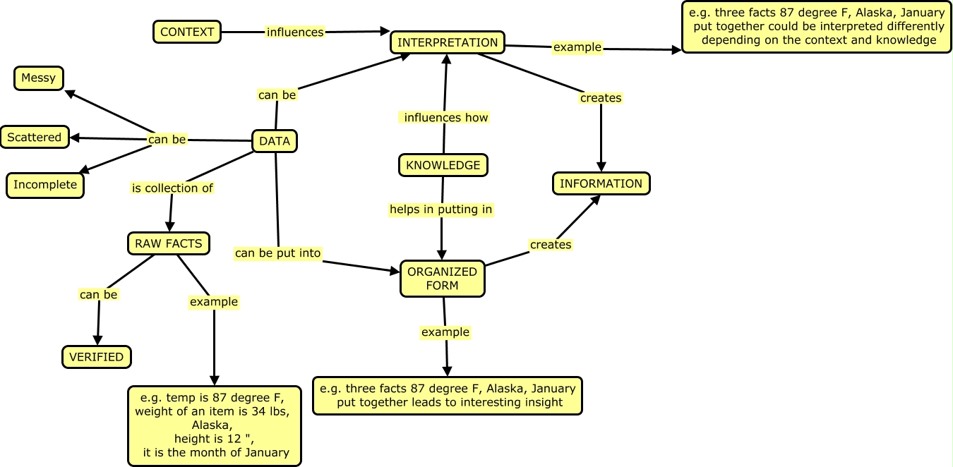 This Concept Map, created with IHMC CmapTools, has information related to: Data, Information, Knowledge, CONTEXT influences INTERPRETATION, DATA can be Incomplete, ORGANIZED FORM example e.g. three facts 87 degree F, Alaska, January put together leads to interesting insight, DATA can be Scattered, INTERPRETATION example e.g. three facts 87 degree F, Alaska, January put together could be interpreted differently depending on the context and knowledge, DATA can be Messy, DATA is collection of RAW FACTS, INTERPRETATION creates INFORMATION, RAW FACTS example e.g. temp is 87 degree F, weight of an item is 34 lbs, Alaska, height is 12 ", it is the month of January, DATA can be INTERPRETATION, KNOWLEDGE influences how INTERPRETATION, KNOWLEDGE helps in putting in ORGANIZED FORM, DATA can be put into ORGANIZED FORM, ORGANIZED FORM creates INFORMATION, RAW FACTS can be VERIFIED