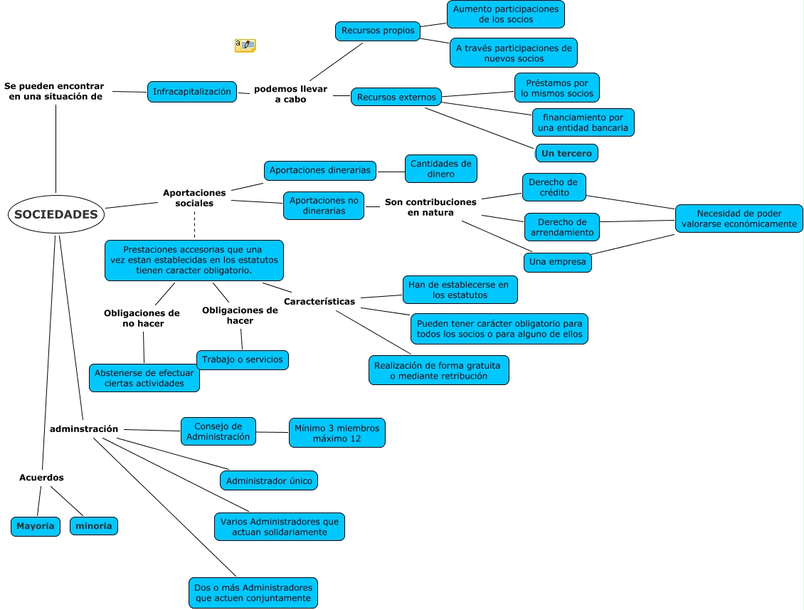 SEGUNDO PROBLEMA DE SOCIEDADES, SOCIEDADES adminstración Varios Administradores que actuan solidariamente, Recursos propios ???? A través participaciones de nuevos socios, SOCIEDADES adminstración Dos o más Administradores que actuen conjuntamente, SOCIEDADES Se pueden encontrar en una situación de Infracapitalización, Recursos externos ???? Préstamos por lo mismos socios, Derecho de arrendamiento ???? Necesidad de poder valorarse económicamente, SOCIEDADES Aportaciones sociales Prestaciones accesorias que una vez estan establecidas en los estatutos tienen caracter obligatorio., Prestaciones accesorias que una vez estan establecidas en los estatutos tienen caracter obligatorio. Características Realización de forma gratuita o mediante retribución, Una empresa ???? Necesidad de poder valorarse económicamente, Infracapitalización podemos llevar a cabo Recursos externos
