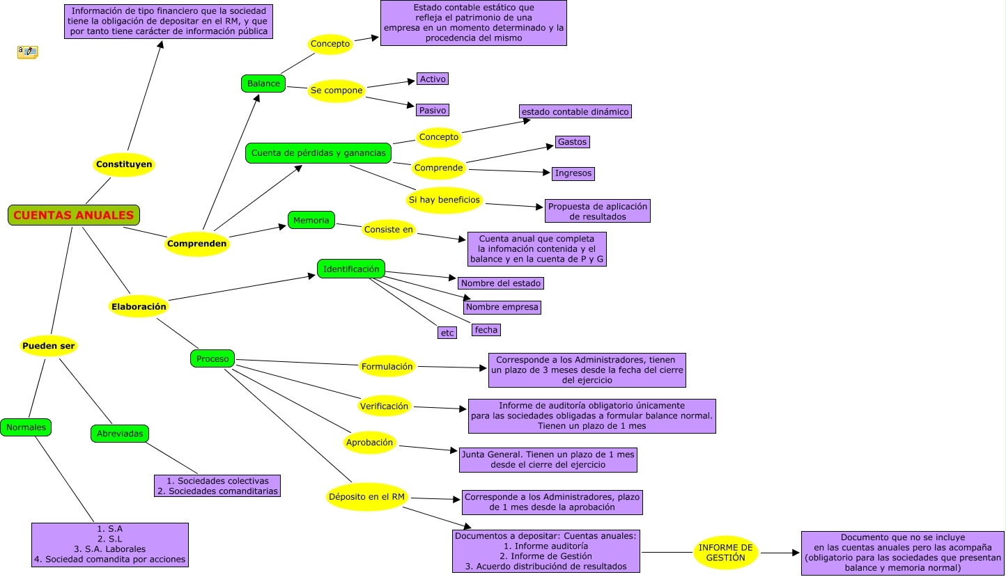 mapa problema nº 4 Passem comptes Jessica Herrera, Memoria Consiste en Cuenta anual que completa la infomación contenida y el balance y en la cuenta de P y G, Identificación ???? etc, Cuenta de pérdidas y ganancias Comprende Ingresos, Cuenta de pérdidas y ganancias Comprende Gastos, Balance Concepto Estado contable estático que refleja el patrimonio de una empresa en un momento determinado y la procedencia del mismo, Proceso Déposito en el RM Documentos a depositar: Cuentas anuales: 1. Informe auditoría 2. Informe de Gestión 3. Acuerdo distribuciónd de resultados, Balance Se compone Pasivo, Abreviadas ???? 1. Sociedades colectivas 2. Sociedades comanditarias, Identificación ???? Nombre del estado, Cuenta de pérdidas y ganancias Concepto estado contable dinámico