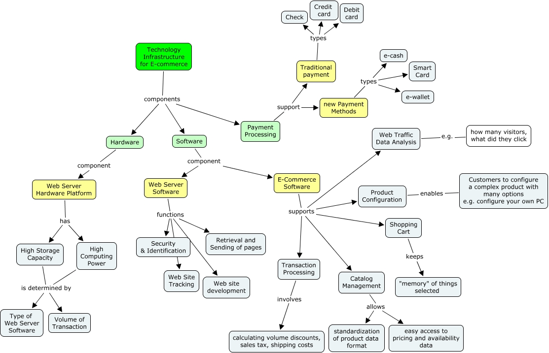 This Concept Map, created with IHMC CmapTools, has information related to: e-commerce infrastructure, E-Commerce Software supports Catalog Management, E-Commerce Software supports Web Traffic Data Analysis, Hardware component Web Server Hardware Platform, Traditional payment types Check, Web Server Software functions Web site development, Web Server Software functions Security & Identification, new Payment Methods types e-wallet, Payment Processing support new Payment Methods, Web Server Software functions Web Site Tracking, Traditional payment types Credit card, E-Commerce Software supports Transaction Processing, High Storage Capacity is determined by Type of Web Server Software, High Storage Capacity is determined by Volume of Transaction, Traditional payment types Debit card, Technology Infrastructure for E-commerce components Software, Web Server Software functions Retrieval and Sending of pages, E-Commerce Software supports Product Configuration, Shopping Cart keeps "memory" of things selected, Transaction Processing involves calculating volume discounts, sales tax, shipping costs, Web Traffic Data Analysis e.g. how many visitors, what did they click