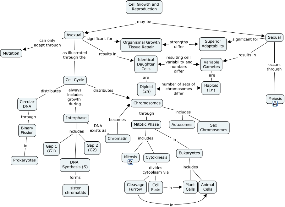 Cell Reproduction, Chromatin becomes Chromosomes, Chromosomes includes Autosomes, Asexual results in Identical Daughter Cells, Asexual can only adapt through Mutation, Chromosomes includes Sex Chromosomes, Sexual significant for Superior Adaptability, Mitotic Phase in Eukaryotes, Interphase includes Gap 2 (G2), Cell Plate in Plant Cells, Cleavage Furrow in Animal Cells