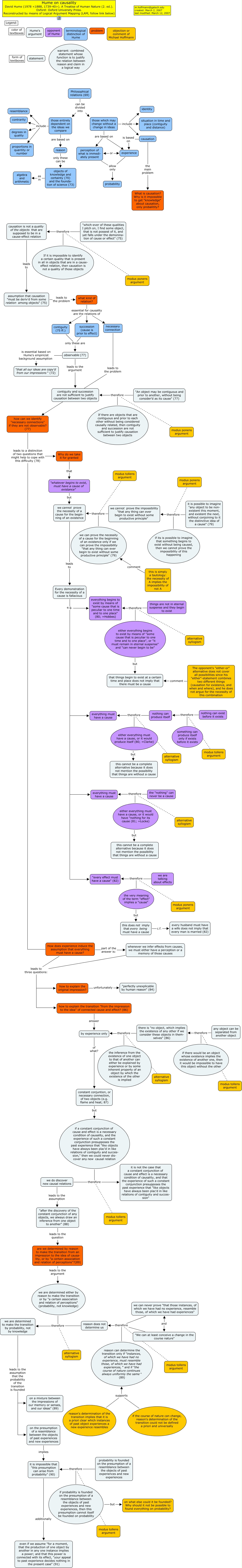 Este Cmap, tiene información relacionada con: Hume on causation, either everything must have a cause, or it would produce itself (80; =Clarke) therefore everything must have a cause, The opponent's "either-or" alternative does not cover all possibilities since his "either"-statement combines two different things (causation for existence, and when and where), and he does not argue for the necessity of this combination comment that things begin to exist at a certain time and place does not imply that there must be a cause, are we determined by reason to make the transition from an impression to the idea of causa- lity, or by "a certain association and relation of perceptions"?(89) leads to the argument we are determined either by reason to make the transition or by "a certain association and relation of perceptions" (probability, not knowledge), modus ponens argument therefore "every effect must have a cause" (82), we cannot prove the impossibility "that any thing can ever begin to exist without some productive principle" therefore we cannot prove the necessity of a cause for the begin- ning of an existence, succession (cause is prior to effect) only these are observable(77), either everything begins to exist by means of "some cause that is peculiar to one time and to one place", or "it must remain in eternal suspense" and "can never begin to be" but that things begin to exist at a certain time and place does not imply that there must be a cause, If there are objects that are contiguous and prior to each other without being considered causally related, then contiguity and succession are not sufficient to justify causation between two objects therefore contiguity and succession are not sufficient to justify causation between two objects, the inference from the existence of one object to that of another can either be explained by experience or by some inherent property of an object by which the existence of the other is implied therefore by experience only, if there would be an object whose existence implies the existence of another one, then it would be impossible to have this object without the other therefore there is "no object, which implies the existence of any other if we consider these objects in them- selves" (86), those entirely dependent on the ideas we compare include degrees in quality, causation the main problem What is causation? Why is it impossible to get "knowledge" about causation, only probalitity?, the "nothing" can never be a cause therefore everything must have a cause, nothing can produce itself therefore everything must have a cause, Philosophical relations (69) can be divided into those entirely dependent on the ideas we compare, observable(77) is essential based on Hume's empiricist background assumption "that all our ideas are copy'd from our impressions" (72), objects of knowledge and certainty (70) and the founda- tion of science (73) as in algebra and arithmetic, reason does not determine us therefore we are determined to make the transition by probability, not by knowledge, Every demonstration for the necessity of a cause is fallacious e.g. everything must have a cause, assumption that causation "must be deriv'd from some relation among objects" (75) leads to the problem what kind of relation?