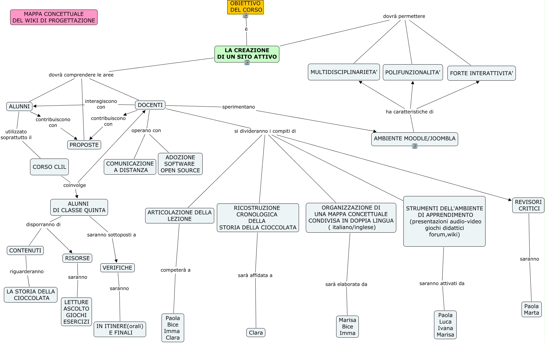 WIKI DI PROGETTAZIONE, LA CREAZIONE DI UN SITO ATTIVO dovrà comprendere le aree DOCENTI, VERIFICHE saranno IN ITINERE(orali) E FINALI, DOCENTI si divideranno i compiti di REVISORI CRITICI, STRUMENTI DELL'AMBIENTE DI APPRENDIMENTO (presentazioni audio-video giochi didattici forum,wiki) saranno attivati da Paola Luca Ivana Marisa, LA CREAZIONE DI UN SITO ATTIVO dovrà permettere MULTIDISCIPLINARIETA', OBIETTIVO DEL CORSO è LA CREAZIONE DI UN SITO ATTIVO, ORGANIZZAZIONE DI UNA MAPPA CONCETTUALE CONDIVISA IN DOPPIA LINGUA ( italiano/inglese) sarà elaborata da Marisa Bice Imma, ALUNNI contribuiscono con PROPOSTE, DOCENTI operano con ADOZIONE SOFTWARE OPEN SOURCE, DOCENTI si divideranno i compiti di STRUMENTI DELL'AMBIENTE DI APPRENDIMENTO (presentazioni audio-video giochi didattici forum,wiki)