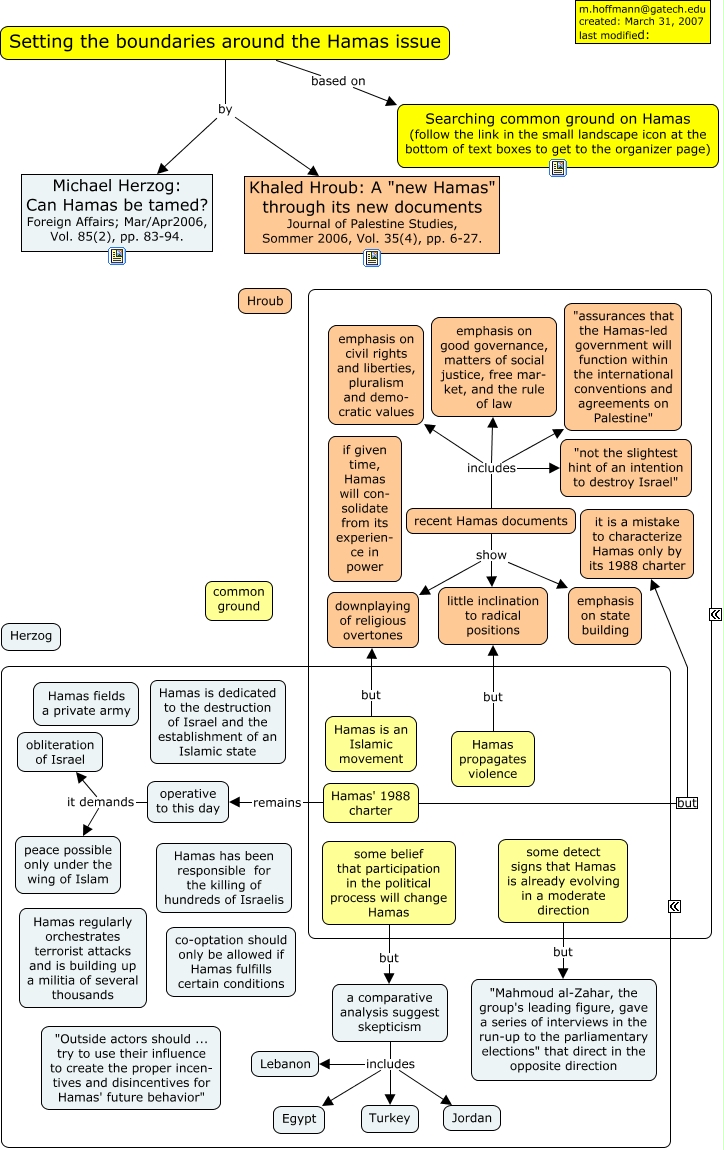 This Concept Map, created with IHMC CmapTools, has information related to: boundary-setting, recent Hamas documents show little inclination to radical positions, Hamas is an Islamic movement but downplaying of religious overtones, operative to this day it demands peace possible only under the wing of Islam, some detect signs that Hamas is already evolving in a moderate direction but "Mahmoud al-Zahar, the group's leading figure, gave a series of interviews in the run-up to the parliamentary elections" that direct in the opposite direction, a comparative analysis suggest skepticism includes Turkey, recent Hamas documents includes emphasis on civil rights and liberties, pluralism and demo- cratic values, Hamas' 1988 charter but it is a mistake to characterize Hamas only by its 1988 charter, recent Hamas documents includes "not the slightest hint of an intention to destroy Israel", recent Hamas documents includes emphasis on good governance, matters of social justice, free mar- ket, and the rule of law, recent Hamas documents show emphasis on state building, a comparative analysis suggest skepticism includes Jordan, recent Hamas documents includes "assurances that the Hamas-led government will function within the international conventions and agreements on Palestine", a comparative analysis suggest skepticism includes Lebanon, some belief that participation in the political process will change Hamas but a comparative analysis suggest skepticism, Setting the boundaries around the Hamas issue based on Searching common ground on Hamas (follow the link in the small landscape icon at the bottom of text boxes to get to the organizer page), Hamas propagates violence but little inclination to radical positions, Setting the boundaries around the Hamas issue by Michael Herzog: Can Hamas be tamed? Foreign Affairs; Mar/Apr2006, Vol. 85(2), pp. 83-94., Setting the boundaries around the Hamas issue by Khaled Hroub: A "new Hamas" through its new documents Journal of Palestine Studies, Sommer 2006, Vol. 35(4), pp. 6-27., a comparative analysis suggest skepticism includes Egypt, recent Hamas documents show downplaying of religious overtones
