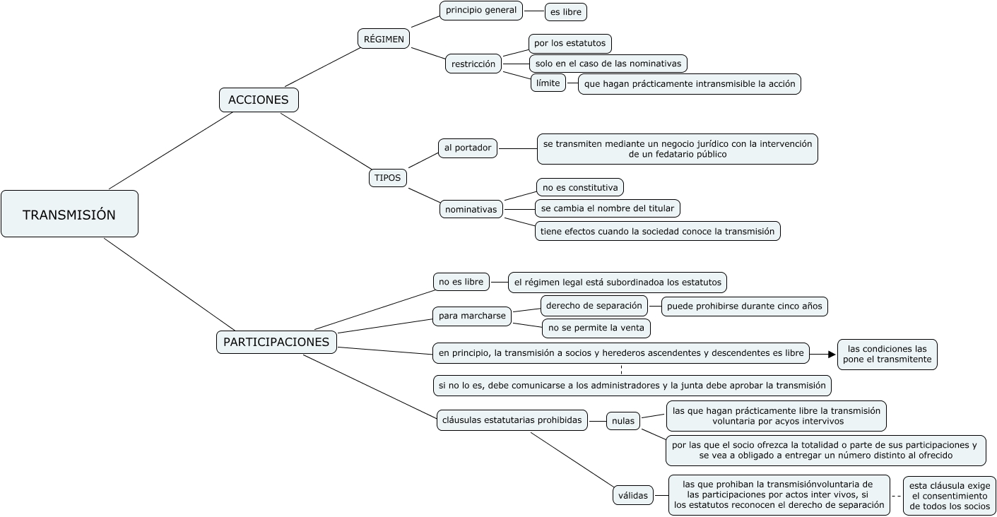 transmisión, para marcharse ???? no se permite la venta, no es libre ???? el régimen legal está subordinadoa los estatutos, nulas ???? las que hagan prácticamente libre la transmisión voluntaria por acyos intervivos, PARTICIPACIONES ???? cláusulas estatutarias prohibidas, al portador ???? se transmiten mediante un negocio jurídico con la intervención de un fedatario público, PARTICIPACIONES ???? en principio, la transmisión a socios y herederos ascendentes y descendentes es libre, las que prohiban la transmisiónvoluntaria de las participaciones por actos inter vivos, si los estatutos reconocen el derecho de separación ???? esta cláusula exige el consentimiento de todos los socios, PARTICIPACIONES ???? no es libre, nominativas ???? se cambia el nombre del titular, límite ???? que hagan prácticamente intransmisible la acción
