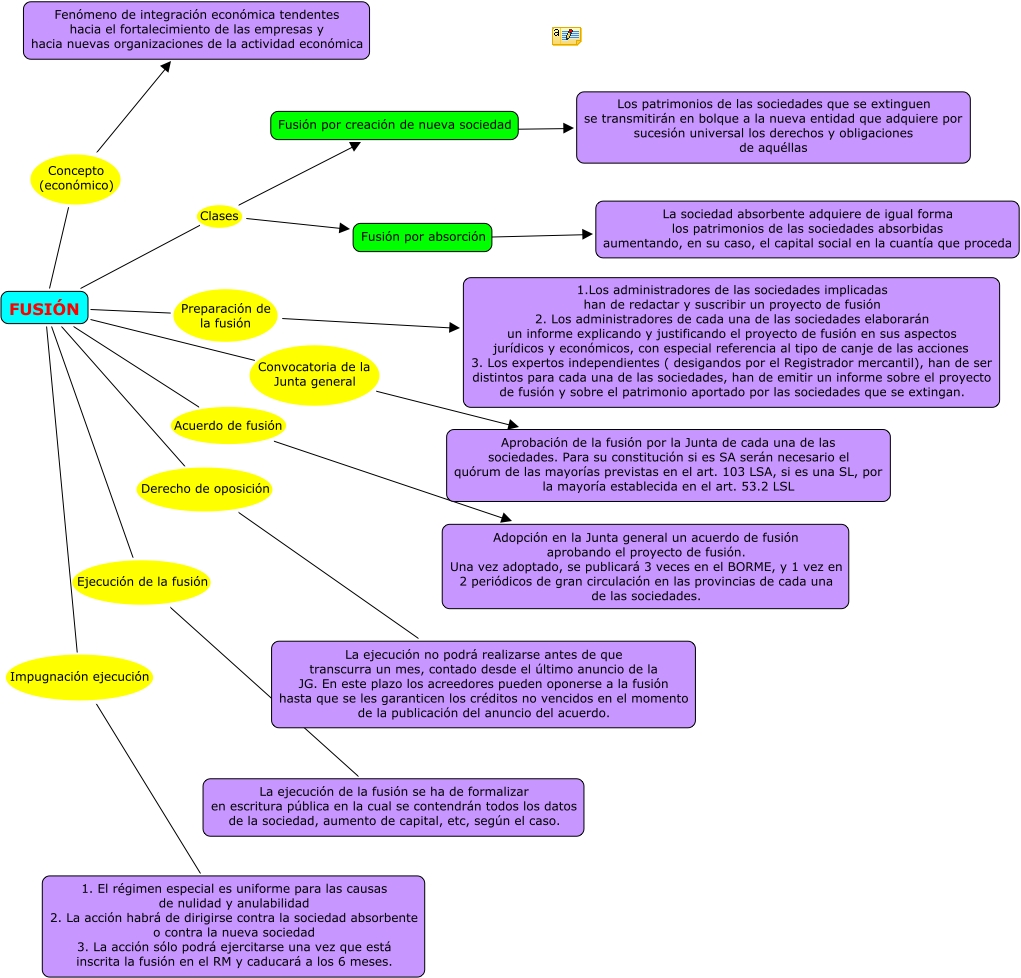 mapa jessica herrera Qui més s'anima problema 8, Fusión por absorción ???? La sociedad absorbente adquiere de igual forma los patrimonios de las sociedades absorbidas aumentando, en su caso, el capital social en la cuantía que proceda, FUSIÓN Clases Fusión por creación de nueva sociedad, FUSIÓN Acuerdo de fusión Adopción en la Junta general un acuerdo de fusión aprobando el proyecto de fusión. Una vez adoptado, se publicará 3 veces en el BORME, y 1 vez en 2 periódicos de gran circulación en las provincias de cada una de las sociedades., FUSIÓN Preparación de la fusión 1.Los administradores de las sociedades implicadas han de redactar y suscribir un proyecto de fusión 2. Los administradores de cada una de las sociedades elaborarán un informe explicando y justificando el proyecto de fusión en sus aspectos jurídicos y económicos, con especial referencia al tipo de canje de las acciones 3. Los expertos independientes ( desigandos por el Registrador mercantil), han de ser distintos para cada una de las sociedades, han de emitir un informe sobre el proyecto de fusión y sobre el patrimonio aportado por las sociedades que se extingan., FUSIÓN Ejecución de la fusión La ejecución de la fusión se ha de formalizar en escritura pública en la cual se contendrán todos los datos de la sociedad, aumento de capital, etc, según el caso., FUSIÓN Convocatoria de la Junta general Aprobación de la fusión por la Junta de cada una de las sociedades. Para su constitución si es SA serán necesario el quórum de las mayorías previstas en el art. 103 LSA, si es una SL, por la mayoría establecida en el art. 53.2 LSL, FUSIÓN Clases Fusión por absorción, FUSIÓN Impugnación ejecución 1. El régimen especial es uniforme para las causas de nulidad y anulabilidad 2. La acción habrá de dirigirse contra la sociedad absorbente o contra la nueva sociedad 3. La acción sólo podrá ejercitarse una vez que está inscrita la fusión en el RM y caducará a los 6 meses., FUSIÓN Derecho de oposición La ejecución no podrá realizarse antes de que transcurra un mes, contado desde el último anuncio de la JG. En este plazo los acreedores pueden oponerse a la fusión hasta que se les garanticen los créditos no vencidos en el momento de la publicación del anuncio del acuerdo., FUSIÓN Concepto (económico) Fenómeno de integración económica tendentes hacia el fortalecimiento de las empresas y hacia nuevas organizaciones de la actividad económica