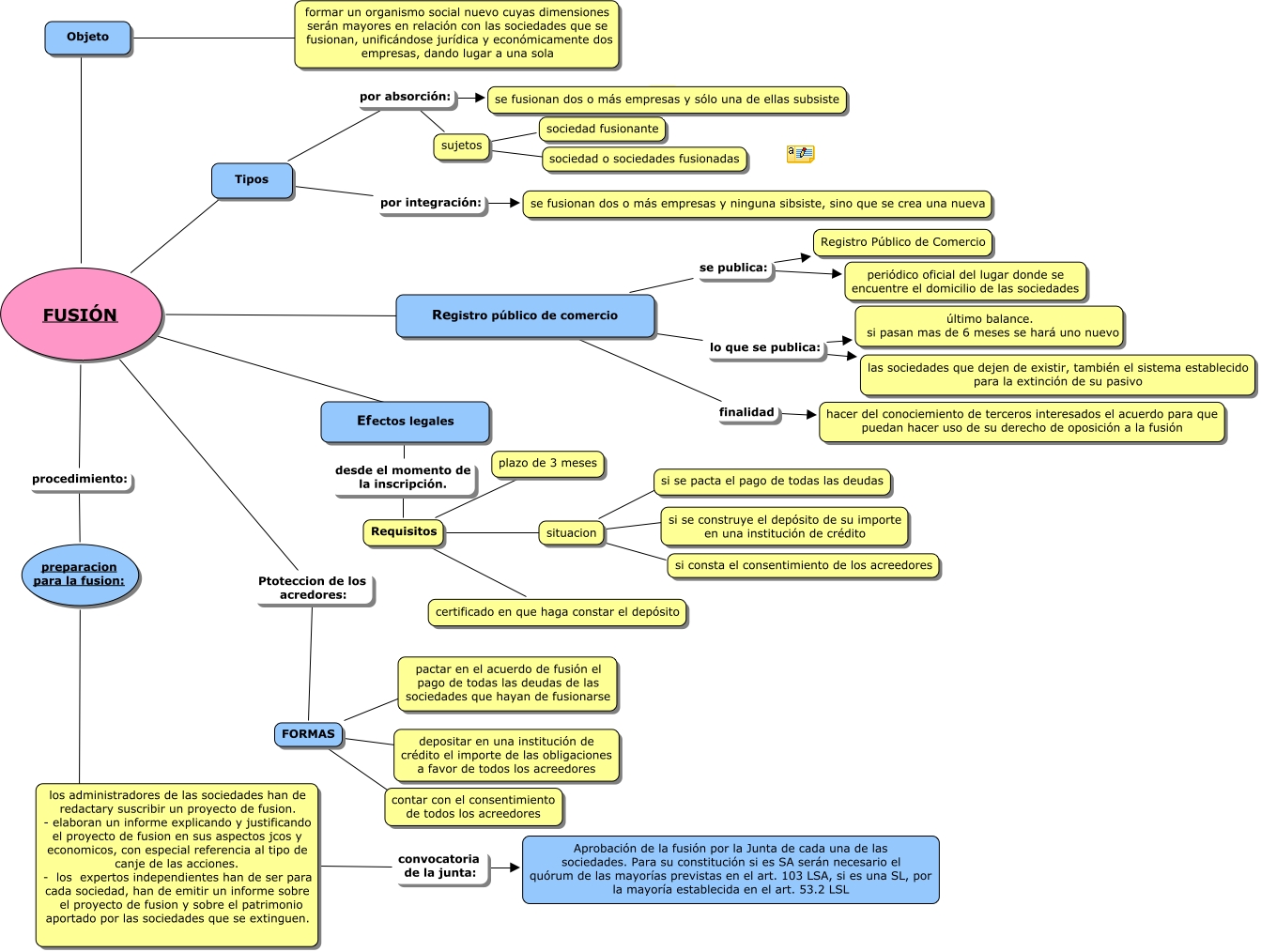 fusion, Registro público de comercio se publica: Registro Público de Comercio, FUSIÓN ???? Registro público de comercio, FUSIÓN Ptoteccion de los acredores: FORMAS, Registro público de comercio finalidad hacer del conociemiento de terceros interesados el acuerdo para que puedan hacer uso de su derecho de oposición a la fusión, FORMAS ???? depositar en una institución de crédito el importe de las obligaciones a favor de todos los acreedores, Requisitos ???? plazo de 3 meses, Registro público de comercio se publica: periódico oficial del lugar donde se encuentre el domicilio de las sociedades, los administradores de las sociedades han de redactary suscribir un proyecto de fusion. - elaboran un informe explicando y justificando el proyecto de fusion en sus aspectos jcos y economicos, con especial referencia al tipo de canje de las acciones. - los expertos independientes han de ser para cada sociedad, han de emitir un informe sobre el proyecto de fusion y sobre el patrimonio aportado por las sociedades que se extinguen. convocatoria de la junta: Aprobación de la fusión por la Junta de cada una de las sociedades. Para su constitución si es SA serán necesario el quórum de las mayorías previstas en el art. 103 LSA, si es una SL, por la mayoría establecida en el art. 53.2 LSL, Tipos por absorción: sujetos, FORMAS ???? pactar en el acuerdo de fusión el pago de todas las deudas de las sociedades que hayan de fusionarse