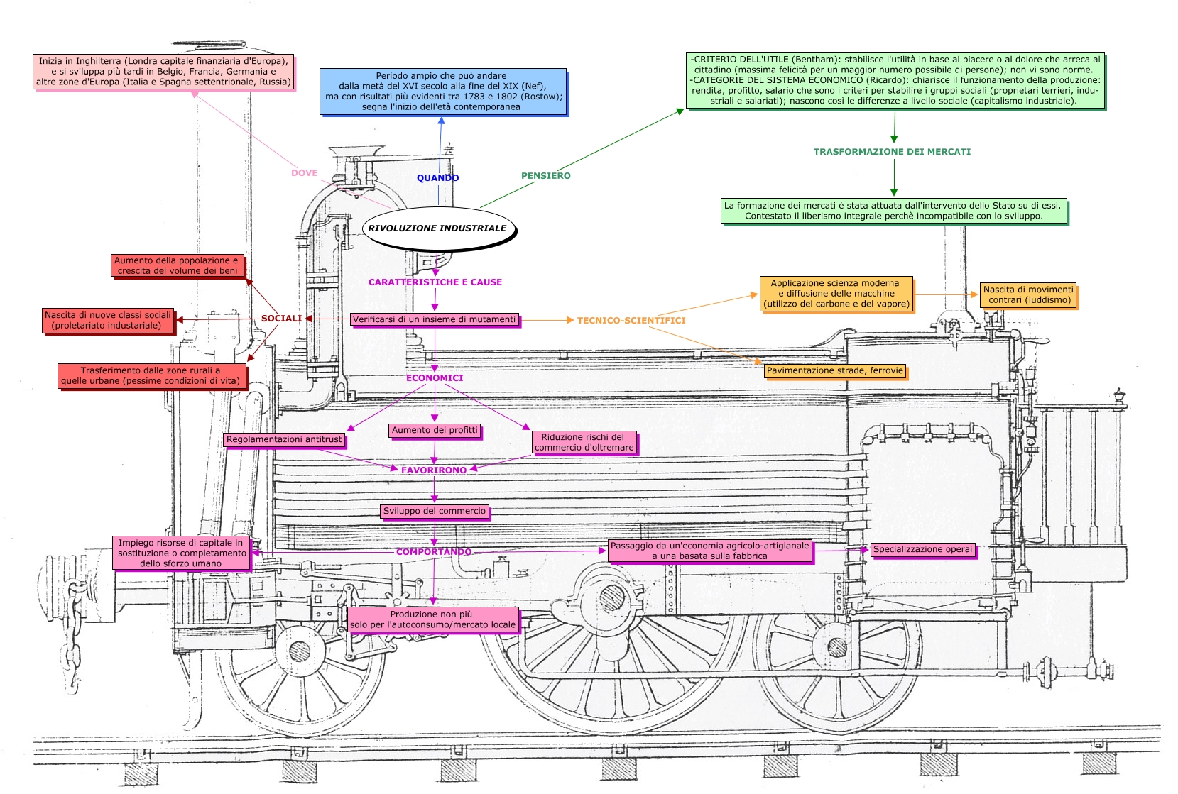 MAPPA OK GRUPPO 5(chia,aly,ste,umbe), Verificarsi di un insieme di mutamenti SOCIALI Trasferimento dalle zone rurali a quelle urbane (pessime condizioni di vita), Verificarsi di un insieme di mutamenti ECONOMICI Riduzione rischi del commercio d'oltremare, RIVOLUZIONE INDUSTRIALE QUANDO Periodo ampio che può andare dalla metà del XVI secolo alla fine del XIX (Nef), ma con risultati più evidenti tra 1783 e 1802 (Rostow); segna l'inizio dell'età contemporanea, Aumento dei profitti FAVORIRONO Sviluppo del commercio, Riduzione rischi del commercio d'oltremare FAVORIRONO Sviluppo del commercio, -CRITERIO DELL'UTILE (Bentham): stabilisce l'utilità in base al piacere o al dolore che arreca al cittadino (massima felicità per un maggior numero possibile di persone); non vi sono norme. -CATEGORIE DEL SISTEMA ECONOMICO (Ricardo): chiarisce il funzionamento della produzione: rendita, profitto, salario che sono i criteri per stabilire i gruppi sociali (proprietari terrieri, indu- striali e salariati); nascono così le differenze a livello sociale (capitalismo industriale). TRASFORMAZIONE DEI MERCATI La formazione dei mercati è stata attuata dall'intervento dello Stato su di essi. Contestato il liberismo integrale perchè incompatibile con lo sviluppo., Verificarsi di un insieme di mutamenti TECNICO-SCIENTIFICI Pavimentazione strade, ferrovie, Verificarsi di un insieme di mutamenti ECONOMICI Aumento dei profitti, Verificarsi di un insieme di mutamenti ECONOMICI Regolamentazioni antitrust, Sviluppo del commercio COMPORTANDO Impiego risorse di capitale in sostituzione o completamento dello sforzo umano