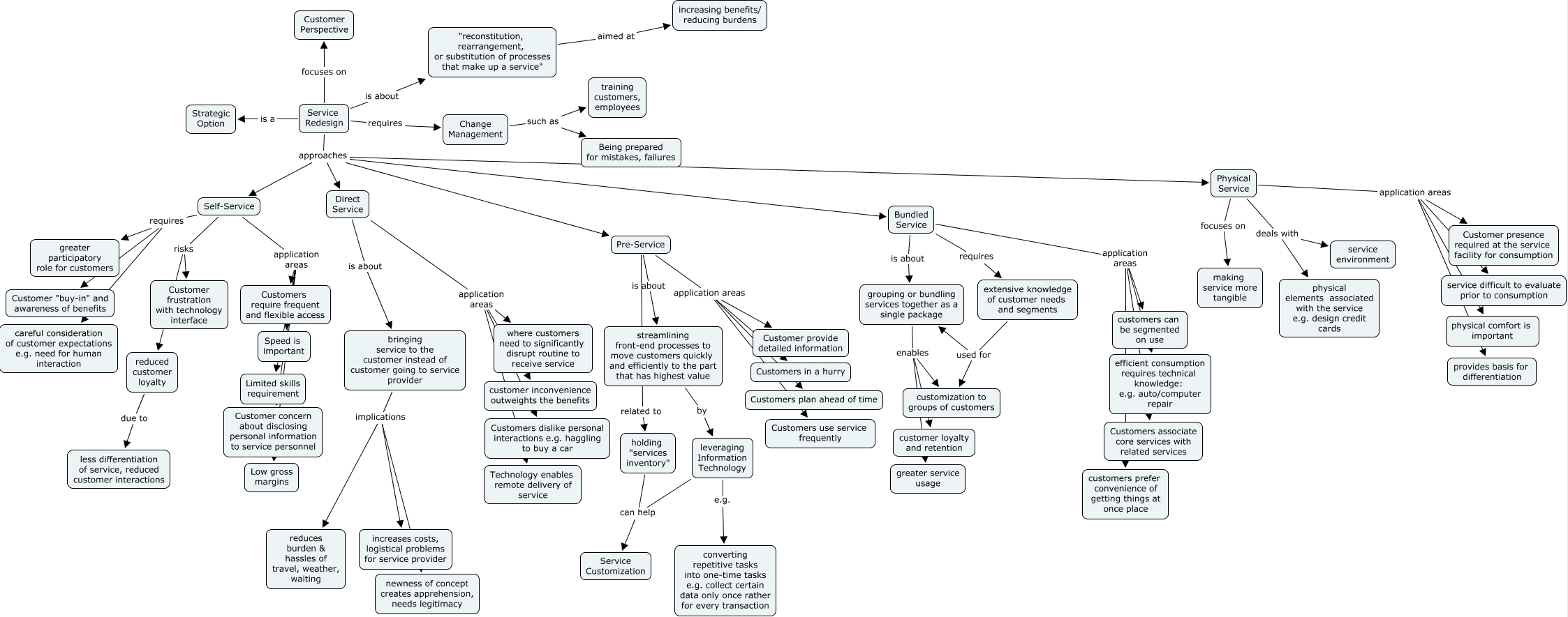 Service Redesign, Pre-Service related to holding "services inventory", Self-Service application areas Speed is important, Bundled Service application areas Customers associate core services with related services, Direct Service is about bringing service to the customer instead of customer going to service provider, leveraging Information Technology e.g. converting repetitive tasks into one-time tasks e.g. collect certain data only once rather for every transaction, Self-Service risks Customer frustration with technology interface, grouping or bundling services together as a single package enables customization to groups of customers, Service Redesign focuses on Customer Perspective, Service Redesign is about "reconstitution, rearrangement, or substitution of processes that make up a service", Service Redesign requires Change Management