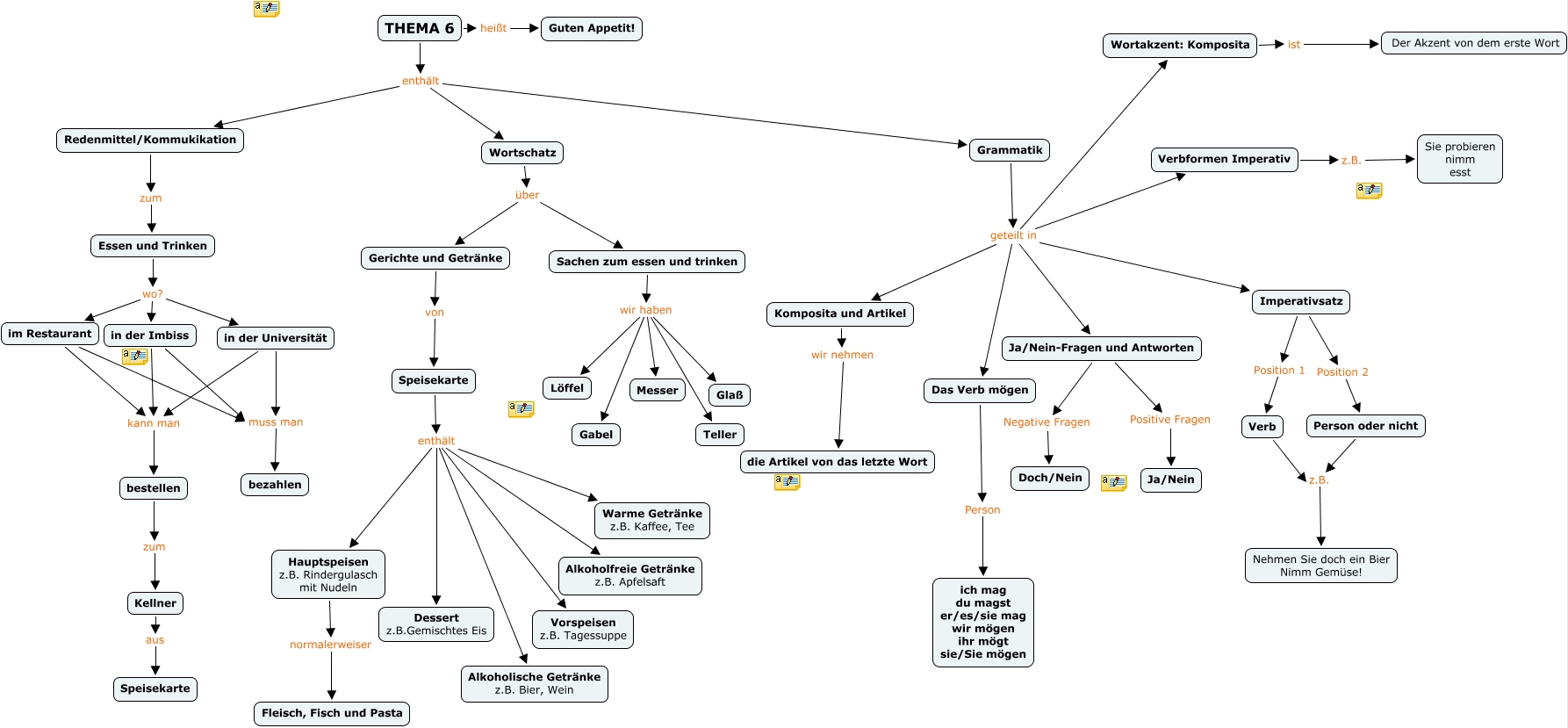 Joaquín Félix (essen und trinken) con anotaciones, Komposita und Artikel wir nehmen die Artikel von das letzte Wort, THEMA 6 heißt Guten Appetit!, in der Imbiss kann man bestellen, in der Universität muss man bezahlen, Ja/Nein-Fragen und Antworten Negative Fragen Doch/Nein, THEMA 6 enthält Grammatik, Essen und Trinken wo? im Restaurant, Speisekarte enthält Hauptspeisen z.B. Rindergulasch mit Nudeln, Essen und Trinken wo? in der Universität, Wortschatz über Gerichte und Getränke