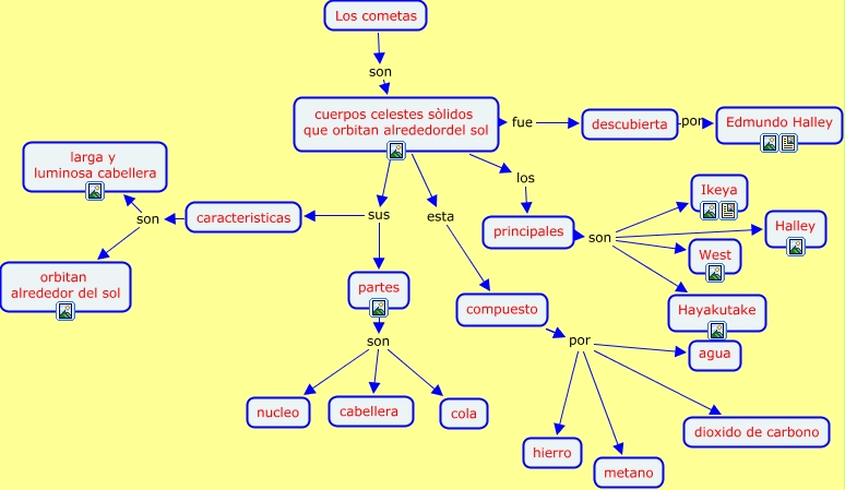 cometas, compuesto por agua, descubierta por Edmundo Halley, principales son Ikeya, compuesto por hierro, compuesto por metano, principales son Halley, partes son nucleo, principales son West, partes son cola, compuesto por dioxido de carbono