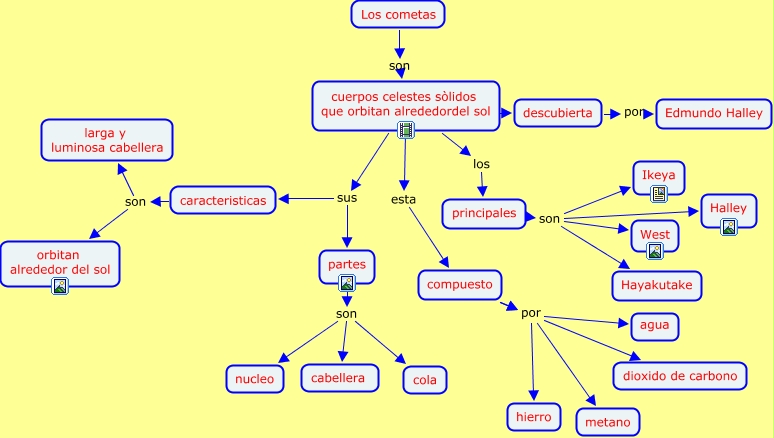 Sin Título, compuesto por agua, descubierta por Edmundo Halley, principales son Ikeya, compuesto por hierro, compuesto por metano, principales son Halley, partes son nucleo, principales son West, partes son cola, compuesto por dioxido de carbono