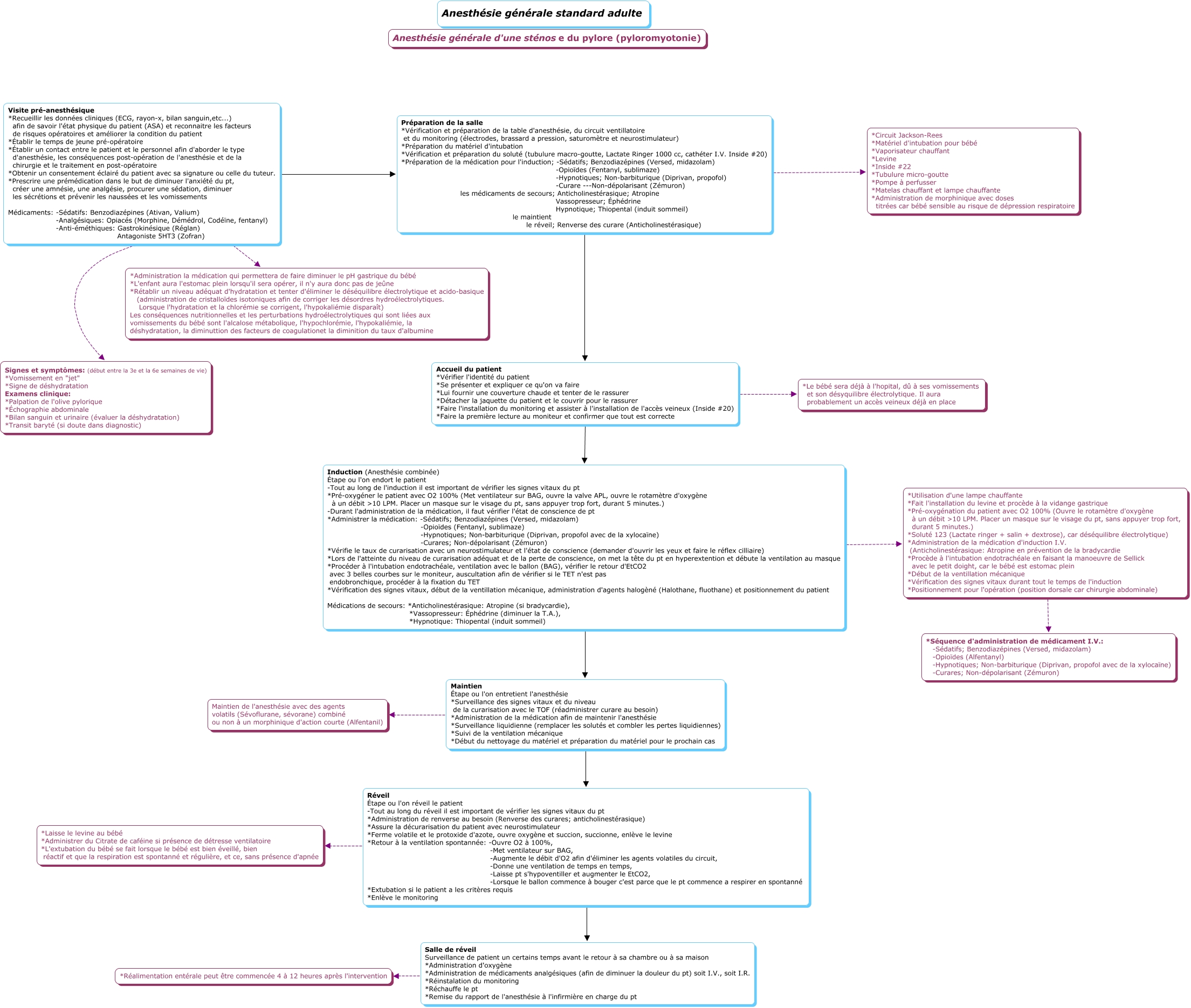 anesthésie sténose du pylore, Réveil Étape ou l'on réveil le patient -Tout au long du réveil il est important de vérifier les signes vitaux du pt *Administration de renverse au besoin (Renverse des curares; anticholinestérasique) *Assure la décurarisation du patient avec neurostimulateur *Ferme volatile et le protoxide d'azote, ouvre oxygène et succion, succionne, enlève le levine *Retour à la ventilation spontannée: -Ouvre O2 à 100%, -Met ventilateur sur BAG, -Augmente le débit d'O2 afin d'éliminer les agents volatiles du circuit, -Donne une ventilation de temps en temps, -Laisse pt s'hypoventiller et augmenter le EtCO2, -Lorsque le ballon commence à bouger c'est parce que le pt commence a respirer en spontanné *Extubation si le patient a les critères requis *Enlève le monitoring *Laisse le levine au bébé *Administrer du Citrate de caféine si présence de détresse ventilatoire *L'extubation du bébé se fait lorsque le bébé est bien éveillé, bien réactif et que la respiration est spontanné et régulière, et ce, sans présence d'apnée, Maintien Étape ou l'on entretient l'anesthésie *Surveillance des signes vitaux et du niveau de la curarisation avec le TOF (réadministrer curare au besoin) *Administration de la médication afin de maintenir l'anesthésie *Surveillance liquidienne (remplacer les solutés et combler les pertes liquidiennes) *Suivi de la ventilation mécanique *Début du nettoyage du matériel et préparation du matériel pour le prochain cas Réveil Étape ou l'on réveil le patient -Tout au long du réveil il est important de vérifier les signes vitaux du pt *Administration de renverse au besoin (Renverse des curares; anticholinestérasique) *Assure la décurarisation du patient avec neurostimulateur *Ferme volatile et le protoxide d'azote, ouvre oxygène et succion, succionne, enlève le levine *Retour à la ventilation spontannée: -Ouvre O2 à 100%, -Met ventilateur sur BAG, -Augmente le débit d'O2 afin d'éliminer les agents volatiles du circuit, -Donne une ventilation de temps en temps, -Laisse pt s'hypoventiller et augmenter le EtCO2, -Lorsque le ballon commence à bouger c'est parce que le pt commence a respirer en spontanné *Extubation si le patient a les critères requis *Enlève le monitoring, *Utilisation d'une lampe chauffante *Fait l'installation du levine et procède à la vidange gastrique *Pré-oxygénation du patient avec O2 100% (Ouvre le rotamètre d'oxygène à un débit ᡂ LPM. Placer un masque sur le visage du pt, sans appuyer trop fort, durant 5 minutes.) *Soluté 123 (Lactate ringer + salin + dextrose), car déséquilibre électrolytique) *Administration de la médication d'induction I.V. (Anticholinestérasique: Atropine en prévention de la bradycardie *Procède à l'intubation endotrachéale en faisant la manoeuvre de Sellick avec le petit doight, car le bébé est estomac plein *Début de la ventillation mécanique *Vérification des signes vitaux durant tout le temps de l'induction *Positionnement pour l'opération (position dorsale car chirurgie abdominale) *Séquence d'administration de médicament I.V.: -Sédatifs; Benzodiazépines (Versed, midazolam) -Opioïdes (Alfentanyl) -Hypnotiques; Non-barbiturique (Diprivan, propofol avec de la xylocaïne) -Curares; Non-dépolarisant (Zémuron), Salle de réveil Surveillance de patient un certains temps avant le retour à sa chambre ou à sa maison *Administration d'oxygène *Administration de médicaments analgésiques (afin de diminuer la douleur du pt) soit I.V., soit I.R. *Réinstalation du monitoring *Réchauffe le pt *Remise du rapport de l'anesthésie à l'infirmière en charge du pt *Réalimentation entérale peut être commencée 4 à 12 heures après l'intervention, Visite pré-anesthésique *Recueillir les données cliniques (ECG, rayon-x, bilan sanguin,etc...) afin de savoir l'état physique du patient (ASA) et reconnaitre les facteurs de risques opératoires et améliorer la condition du patient *Établir le temps de jeune pré-opératoire *Établir un contact entre le patient et le personnel afin d'aborder le type d'anesthésie, les conséquences post-opération de l'anesthésie et de la chirurgie et le traitement en post-opératoire *Obtenir un consentement éclairé du patient avec sa signature ou celle du tuteur. *Prescrire une prémédication dans le but de diminuer l'anxiété du pt, créer une amnésie, une analgésie, procurer une sédation, diminuer les sécrétions et prévenir les naussées et les vomissements Médicaments: -Sédatifs: Benzodiazépines (Ativan, Valium) -Analgésiques: Opiacés (Morphine, Démédrol, Codéïne, fentanyl) -Anti-éméthiques: Gastrokinésique (Réglan) Antagoniste 5HT3 (Zofran) *Administration la médication qui permettera de faire diminuer le pH gastrique du bébé *L'enfant aura l'estomac plein lorsqu'il sera opérer, il n'y aura donc pas de jeûne *Rétablir un niveau adéquat d'hydratation et tenter d'éliminer le déséquilibre électrolytique et acido-basique (administration de cristalloïdes isotoniques afin de corriger les désordres hydroélectrolytiques. Lorsque l'hydratation et la chlorémie se corrigent, l'hypokaliémie disparaît) Les conséquences nutritionnelles et les perturbations hydroélectrolytiques qui sont liées aux vomissements du bébé sont l'alcalose métabolique, l'hypochlorémie, l'hypokaliémie, la déshydratation, la diminuttion des facteurs de coagulationet la diminition du taux d'albumine, Visite pré-anesthésique *Recueillir les données cliniques (ECG, rayon-x, bilan sanguin,etc...) afin de savoir l'état physique du patient (ASA) et reconnaitre les facteurs de risques opératoires et améliorer la condition du patient *Établir le temps de jeune pré-opératoire *Établir un contact entre le patient et le personnel afin d'aborder le type d'anesthésie, les conséquences post-opération de l'anesthésie et de la chirurgie et le traitement en post-opératoire *Obtenir un co