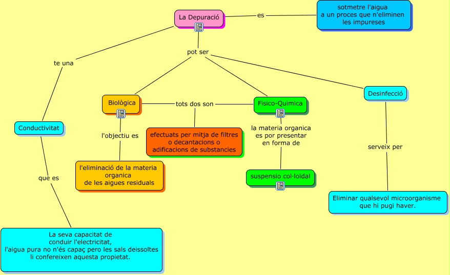 Este Cmap, tiene información relacionada con: La Depuració, Biològica l'objectiu es l'eliminació de la materia organica de les aigues residuals, Conductivitat que es La seva capacitat de conduir l'electricitat, l'aigua pura no n'és capaç pero les sals deissoltes li confereixen aquesta propietat., Desinfecció serveix per Eliminar qualsevol microorganisme que hi pugi haver., La Depuració pot ser Desinfecció, Biològica tots dos son Fisico-Quimica, La Depuració te una Conductivitat, La Depuració pot ser Fisico-Quimica, La Depuració pot ser Biològica, La Depuració es sotmetre l'aigua a un proces que n'eliminen les impureses, Biològica tots dos son efectuats per mitja de filtres o decantacions o adificacions de substancies, Fisico-Quimica la materia organica es por presentar en forma de suspensio col·loïdal