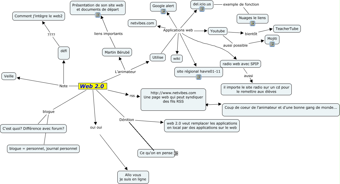 web20, Web 2.0 blogue C'est quoi? Différence avec forum?, Web 2.0 Dénition auto-construit, Youtube bientôt TeacherTube, Web 2.0 rss http://www.netvibes.com Une page web qui peut syndiquer des fils RSS, Web 2.0 L'animateur Martin Bérubé, del.icio.us exemple de fonction Nuages le liens, Web 2.0 Dénition http://fr.wikipedia.org/wiki/Web2, Web 2.0 Note Veille, Web 2.0 L'animateur Utilise, Web 2.0 Dénition Interactif