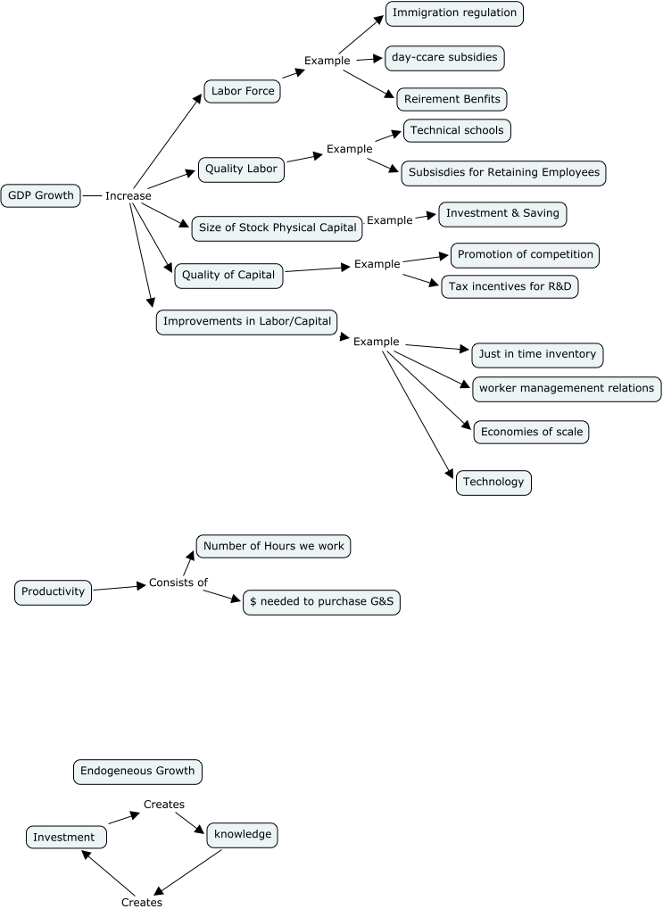 Chapter 6 GDP Growth & Endogenous growth, GDP Growth Increase Quality of Capital, GDP Growth Increase Labor Force, Improvements in Labor/Capital Example Economies of scale, Improvements in Labor/Capital Example Just in time inventory, GDP Growth Increase Size of Stock Physical Capital, Productivity Consists of Number of Hours we work, Quality Labor Example Subsisdies for Retaining Employees, Quality of Capital Example Tax incentives for R&D, Improvements in Labor/Capital Example worker managemenent relations, Labor Force Example day-ccare subsidies