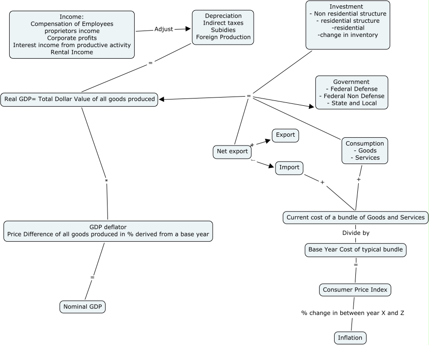 Chapter 2 Measuring GDP and Inflation, Investment - Non residential structure - residential structure -residential -change in inventory = Government - Federal Defense - Federal Non Defense - State and Local, Net export + Export, Consumption - Goods - Services = Government - Federal Defense - Federal Non Defense - State and Local, Current cost of a bundle of Goods and Services Divide by Base Year Cost of typical bundle, Investment - Non residential structure - residential structure -residential -change in inventory = Real GDP= Total Dollar Value of all goods produced, Net export = Government - Federal Defense - Federal Non Defense - State and Local, Net export = Real GDP= Total Dollar Value of all goods produced, Depreciation Indirect taxes Subidies Foreign Production = Real GDP= Total Dollar Value of all goods produced, GDP deflator Price Difference of all goods produced in % derived from a base year = Nominal GDP, Base Year Cost of typical bundle = Consumer Price Index