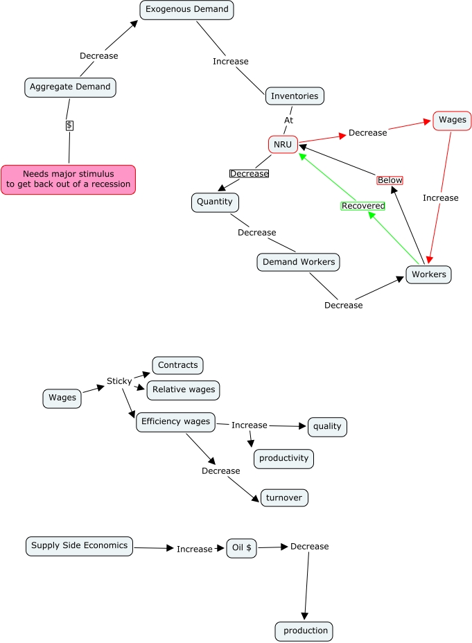 Chapter 5 Moving into a recession, Wages Sticky Contracts, Efficiency wages Decrease turnover, Demand Workers Decrease Workers, Quantity Decrease Demand Workers, Workers Recovered NRU, Workers Below NRU, Inventories At NRU, Supply Side Economics Increase Oil $, Oil $ Decrease production, NRU Decrease Quantity