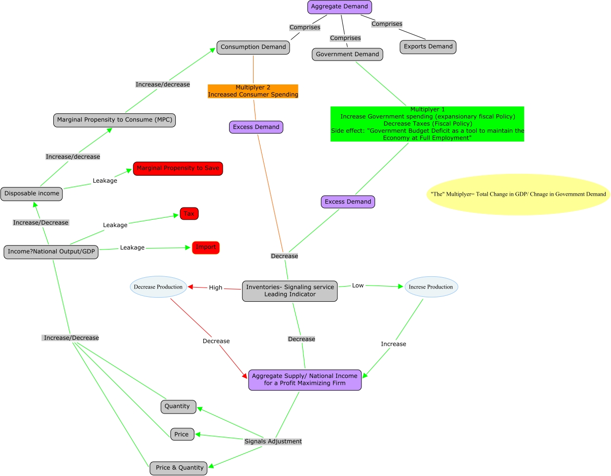 Chapter 4 Aggregate Demand & Multiplier, Income?National Output/GDP Increase/Decrease Price & Quantity, Aggregate Demand Comprises Government Demand, Decrease Production Decrease Aggregate Supply/ National Income for a Profit Maximizing Firm, Marginal Propensity to Consume (MPC) Increase/decrease Consumption Demand, Inventories- Signaling service Leading Indicator Low Increse Production, Increse Production Increase Aggregate Supply/ National Income for a Profit Maximizing Firm, Excess Demand Decrease Inventories- Signaling service Leading Indicator, Income?National Output/GDP Increase/Decrease Quantity, Excess Demand Decrease Inventories- Signaling service Leading Indicator, Aggregate Supply/ National Income for a Profit Maximizing Firm Signals Adjustment Price