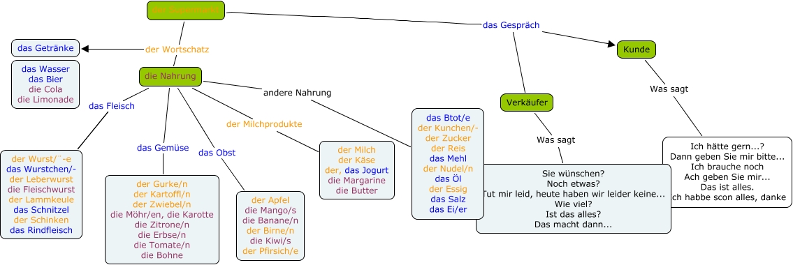 Supermercado, der Supermarkt das Gespräch Kunde, der Supermarkt das Gespräch Verkäufer, die Nahrung das Fleisch der Wurst/¨-e das Wurstchen/- der Leberwurst die Fleischwurst der Lammkeule das Schnitzel der Schinken das Rindfleisch, Verkäufer Was sagt Sie wünschen? Noch etwas? Tut mir leid, heute haben wir leider keine... Wie viel? Ist das alles? Das macht dann..., Kunde Was sagt Ich hätte gern...? Dann geben Sie mir bitte... Ich brauche noch Ach geben Sie mir... Das ist alles. Ich habbe scon alles, danke, der Supermarkt der Wortschatz das Getränke, die Nahrung das Obst der Apfel die Mango/s die Banane/n der Birne/n die Kiwi/s der Pfirsich/e, die Nahrung das Gemüse der Gurke/n der Kartoffl/n der Zwiebel/n die Möhr/en, die Karotte die Zitrone/n die Erbse/n die Tomate/n die Bohne, die Nahrung das Fleisch der Wurst/¨-e das Wurstchen/- der Leberwurst die Fleischwurst der Lammkeule das Schnitzel der Schinken das Rindfleisch, der Supermarkt der Wortschatz die Nahrung