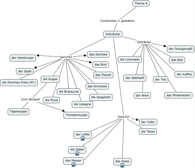 Thema 6 - Arturo, Vokubular Gerichte die Lasagne, Vokubular Gerichte die Bratwurst, Vokubular Getränke der Wein, Vokubular Getränke der Orangensaft, Vokubular Getränke die Limonade, Vokubular Gerichte das Fleisch, Vokubular Geschirr der Löffel, die Suppe Zum Beispiel Tagessuppe, Vokubular Gerichte der Salat, Vokubular Gerichte das Gemüse