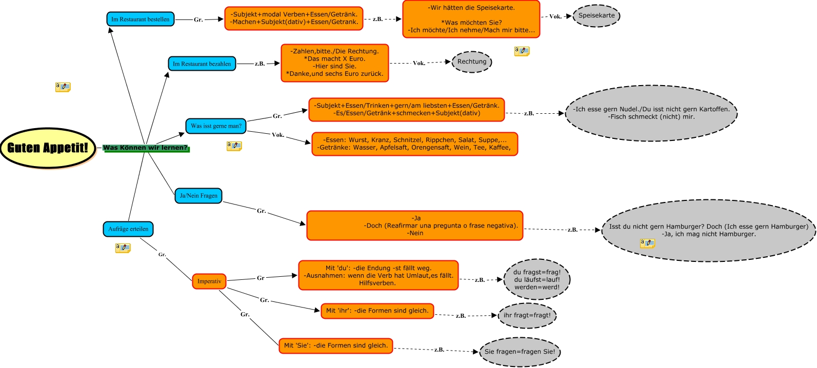 Juan Miguel Peiró con anotaciones, -Subjekt+modal Verben+Essen/Getränk. -Machen+Subjekt(dativ)+Essen/Getrank. z.B. -Wir hätten die Speisekarte. *Was möchten Sie? -Ich möchte/Ich nehme/Mach mir bitte..., Guten Appetit! Was Können wir lernen? Ja/Nein Fragen, Aufräge erteilen Gr. Imperativ, Mit 'du': -die Endung -st fällt weg. -Ausnahmen: wenn die Verb hat Umlaut,es fällt. Hilfsverben. z.B. du fragst=frag! du läufst=lauf! werden=werd!, Ja/Nein Fragen Gr. -Ja -Doch (Reafirmar una pregunta o frase negativa). -Nein, Guten Appetit! Was Können wir lernen? Aufräge erteilen, Guten Appetit! Was Können wir lernen? Im Restaurant bestellen, Was isst gerne man? Gr. -Subjekt+Essen/Trinken+gern/am liebsten+Essen/Getränk. -Es/Essen/Getränk+schmecken+Subjekt(dativ), Im Restaurant bezahlen z.B. -Zahlen,bitte./Die Rechtung. *Das macht X Euro. -Hier sind Sie. *Danke,und sechs Euro zurück., Mit 'Sie': -die Formen sind gleich. z.B. Sie fragen=fragen Sie!