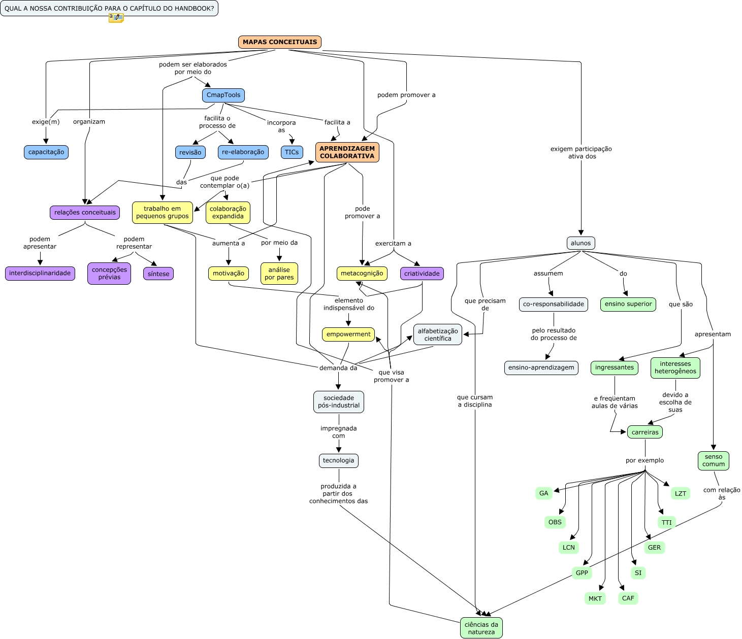 Este Mapa Conceitual tem informações relacionadas a: Aprendizagem colaborativa e MCs, metacognição elemento indispensável do empowerment, criatividade elemento indispensável do empowerment, relações conceituais podem apresentar interdisciplinaridade, carreiras por exemplo TTI, alunos que são ingressantes, ciências da natureza que visa promover a APRENDIZAGEM COLABORATIVA, alunos que cursam a disciplina ciências da natureza, criatividade demanda da sociedade pós-industrial, CmapTools facilita o processo de revisão, relações conceituais podem representar síntese