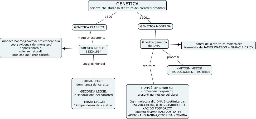 genetica, il codice genetico del DNA struttura il DNA è contenuto nei cromosomi, corpuscoli presenti nel nucleo cellulare Ogni molecola diu DNA è costituita da: -uno ZUCCHERO, il DESSOSIRIBOSIO -ACIDO FOSFORICO -quattro diverse BASI AZOTATE: ADENINA, GUANINA,CITOSINA e TIMINA, GENETICA scienza che studia la struttura dei caratteri ereditari 1900... GENETICA MODERNA, il codice genetico del DNA ???? ipotesi della struttura molecolare formulata da JAMES WATSON e FRANCIS CRICK, GENETICA scienza che studia la struttura dei caratteri ereditari 1800 GENETICA CLASSICA, GENETICA MODERNA IL il codice genetico del DNA, il codice genetico del DNA processi -MITOSI- MEIOSI -PRODUZIONE DI PROTEINE, GENETICA CLASSICA maggior esponente GREGOR MENDEL 1822-1884, GREGOR MENDEL 1822-1884 ???? monaco boemo,(doveva provvedere alla sopravvivenza del monatero) appassionato di scienze naturali. studioso dell' ereditarietà., GREGOR MENDEL 1822-1884 Leggi di Mendel -PRIMA LEGGE: dominanza dei caratteri -SECONDA LEGGE: la separazione dei caratteri _TERZA LEGGE: l' indipendenza dei caratteri