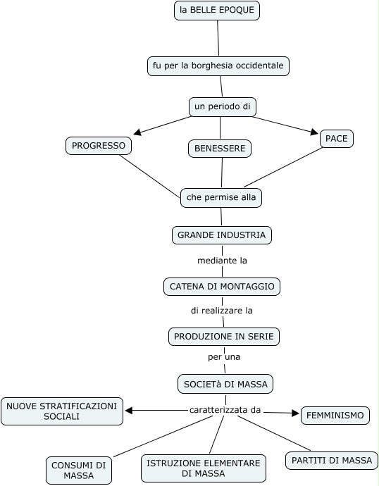schema1, PRODUZIONE IN SERIE per una SOCIETà DI MASSA, GRANDE INDUSTRIA mediante la CATENA DI MONTAGGIO, la BELLE EPOQUE ???? fu per la borghesia occidentale, SOCIETà DI MASSA caratterizzata da CONSUMI DI MASSA, che permise alla ???? GRANDE INDUSTRIA, SOCIETà DI MASSA caratterizzata da NUOVE STRATIFICAZIONI SOCIALI, CATENA DI MONTAGGIO di realizzare la PRODUZIONE IN SERIE, un periodo di ???? BENESSERE, un periodo di ???? PROGRESSO, PROGRESSO ???? che permise alla