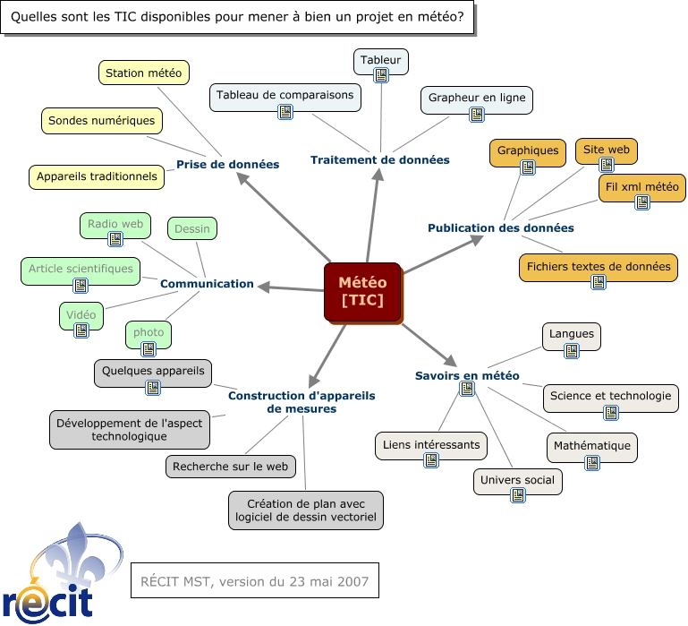 This Concept Map has information related to: meteoTIC, Météo [TIC] Prise de données Sondes numériques, Météo [TIC] Prise de données Appareils traditionnels, Météo [TIC] Savoirs en météo Mathématique, Météo [TIC] Traitement de données Tableau de comparaisons, Météo [TIC] Traitement de données Tableur, Météo [TIC] Traitement de données Grapheur en ligne, Météo [TIC] Construction d'appareils de mesures Recherche sur le web, Météo [TIC] Publication des données Fichiers textes de données, Météo [TIC] Construction d'appareils de mesures Quelques appareils, Météo [TIC] Communication Article scientifiques
